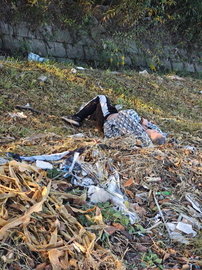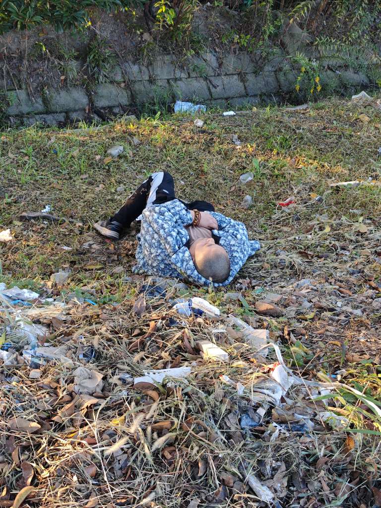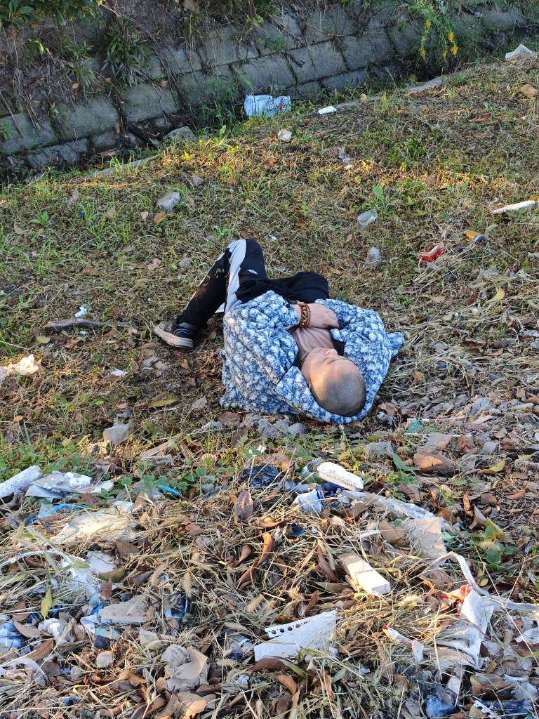 七点钟,花鸟市场红绿灯附近,斜坡躺着一个人,有好心人士经过去看看是否需要帮助